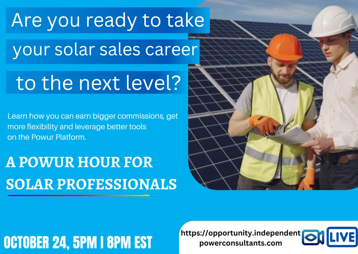 While you’re no stranger to solar, we’d like to introduce you to the world of Powur – the fastest-growing solar company in America for a reason. Join us for this special one-hour event and learn how thousands of solar professionals are making the switch to the Powur platform and earning better commissions, offering more flexible and affordable product options to their customers, leveraging our platform to build a thriving solar organization, and earning more time freedom in the process with our 100% virtual platform. This is your chance to learn about the platform that is changing the industry.