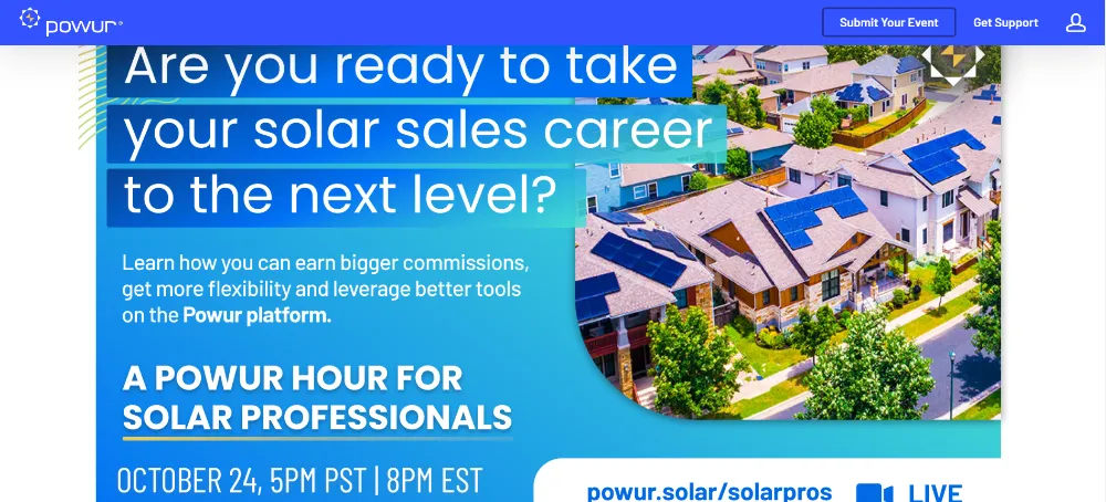 While you’re no stranger to solar, we’d like to introduce you to the world of Powur – the fastest-growing solar company in America for a reason. Join us for this special one-hour event and learn how thousands of solar professionals are making the switch to the Powur platform and earning better commissions, offering more flexible and affordable product options to their customers, leveraging our platform to build a thriving solar organization, and earning more time freedom in the process with our 100% virtual platform. This is your chance to learn about the platform that is changing the industry.